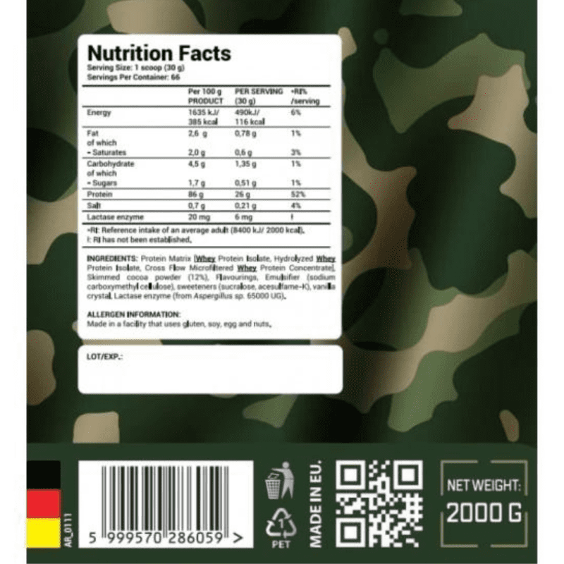 ISO 1 (4540 гр) Army 1 е висококачествен суроватъчен изолат на прах с 166 дози. Осигурява високо съдържание на протеин за ефективно възстановяване и мускулен растеж след тренировка.